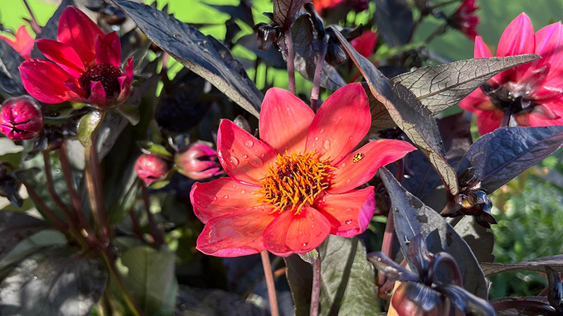 Årets sommarblomstema går i färgtoner från varmt orangea till svalare ljust violetta. Bland blommorna hittar du bland annat av lejongap, petunior, chokladskära, stjärnöga, femtunga, jätteverbena, dahlior och små- och storblommiga klematis. Du hittar också rönnspirea, japansk rönn, dvärgsyrén, prydnadsgräs, chokladmynta, alunrot, kaladium, syddracena, hängsparris och oxalis och mycket annat.