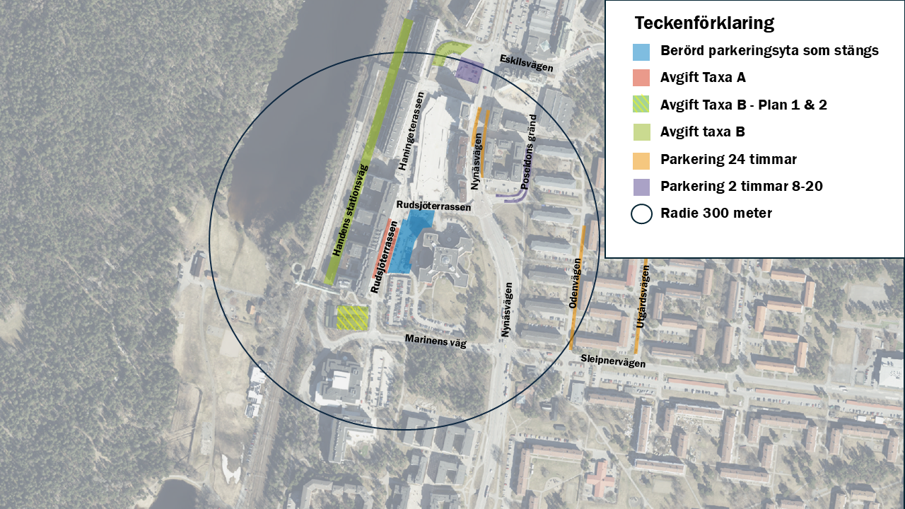 Vinkeln som idag är parkeringsyta ingår i utvecklingen av Haningeterassen med uppemot 700 nya bostäder, en bussterminal, vårdlokaler och plats för service och handel. Marken ska under hösten förberedas för den nya bebyggelsen och parkeringen kommer därför att behöva stänga den 16 oktober.