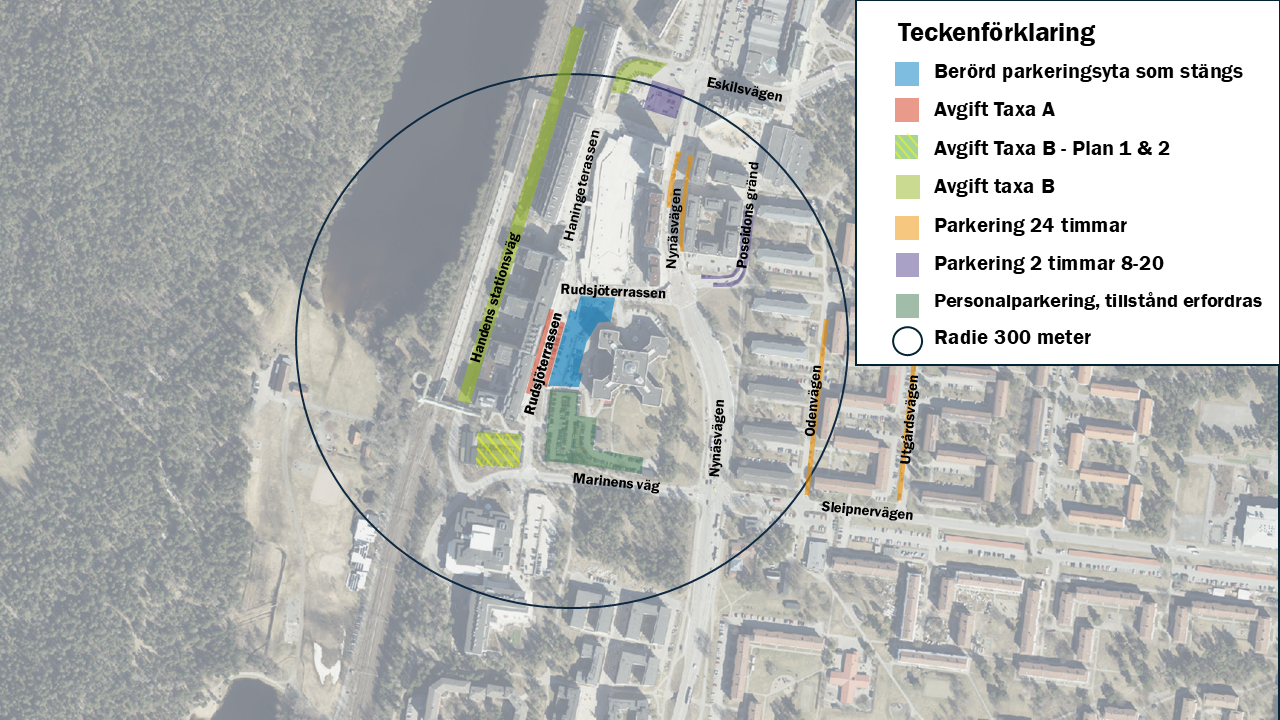 Det finns andra parkeringar i närheten som du i stället kan använda, bland annat i parkeringshus Rudsjöterrassen 11, som ligger lite längre söderut längs Rudsjöterrassen. Kartan ovan visar fler möjliga parkeringar i närområdet.