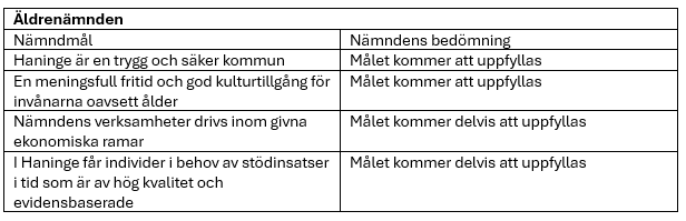 Äldrenämnden prognostiserar ett underskott på 11,1 miljoner kronor för hela året. Prognosen är förbättrad jämfört med delårsrapport 1 på grund av fler statsbidrag. I prognosen ingår åtgärder på 23,5 miljoner kronor. Underskottet beror dels på stora kostnader inom hemtjänst i egen regi och att ett ökat antal individer har behov av särskilt boende. Nämnden kommer delvis att uppfylla två mål och helt två mål.