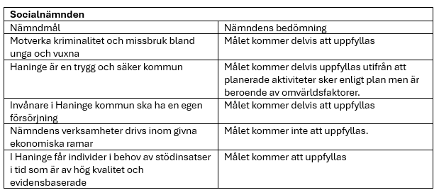 Socialnämnden prognostiserar ett budgetunderskott på 103 miljoner kronor för helåret. I prognosen ingår effektiviseringar om 38 miljoner kronor. De ökade kostnaderna beror främst på placerade barn med kopplingar till kriminalitet, ett ökat antal individer i behov av gruppbostad och daglig verksamhet enligt LSS och fler hushåll i behov av ekonomiskt bistånd på grund av ökad arbetslöshet. Förvaltningen har tagit fram en flerårig åtgärdsplan för att komma till rätta med underskottet. Vad gäller måluppfyllelsen så beräknas tre av fem mål uppfyllas helt eller delvis: