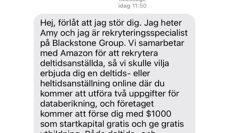 Flera av Haninge kommuns medarbetare har i dag fått meddelande från någon som kallar sig Amy på Blackstone Group. Detta är ett större försök till så kallat kryptobedrägeri och inte det fina jobberbjudande det ser ut att vara.