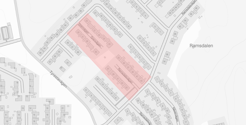 Vi har för närvarande en vattenläcka på Grenvägen. Reparationen kommer att påverka vattenleveransen till de i kartan markerade fastigheterna.