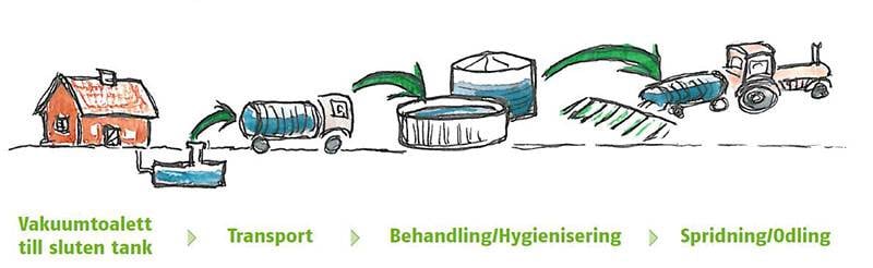 Illustrationen visar enskilda avlopp i kretslopp. Omkring 90 % av avloppets kväve och fosfor kan återföras om toalettavloppet samlas in. Bild från Södertälje kommun.