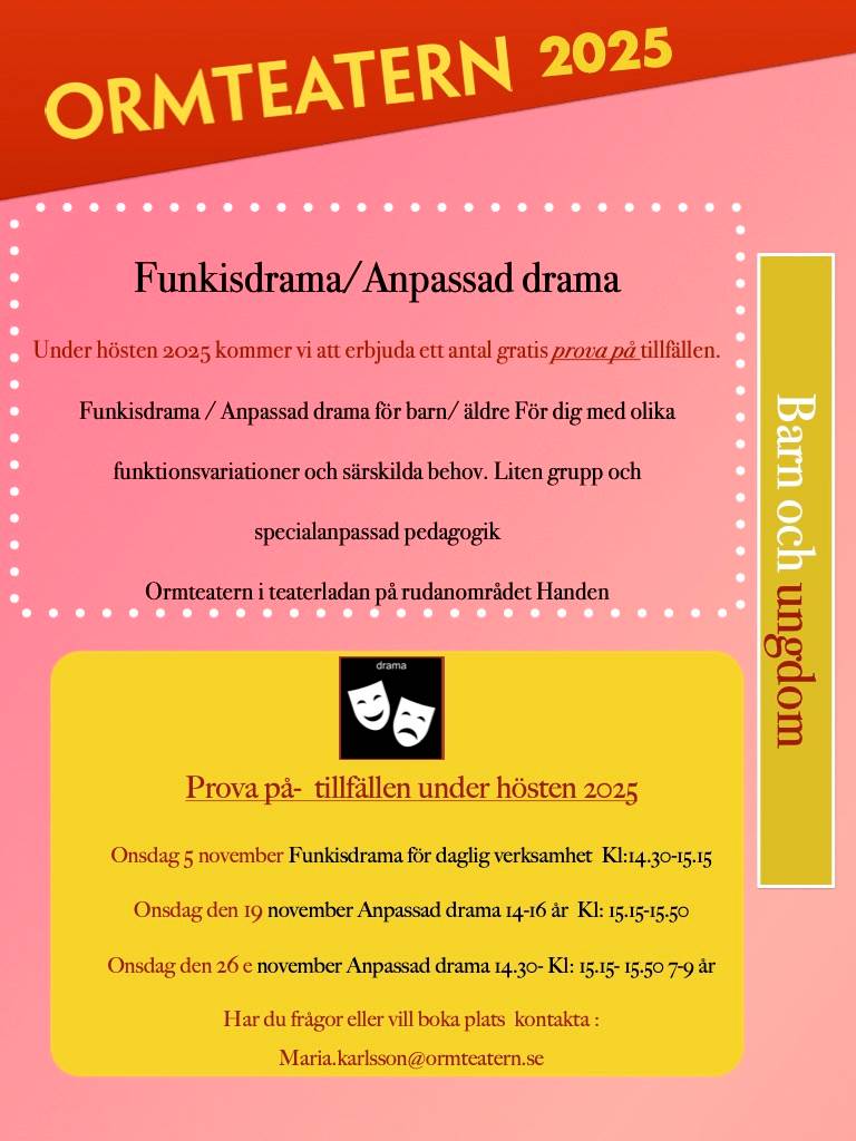Under hösten erbjuder vi gratis prova-på-drama. Aktiviteten riktar sig till dig med funktionsvariationer eller särskilda behov. Vi arbetar i små grupper med specialanpassad pedagogik för att skapa en trygg och lustfylld upplevelse.