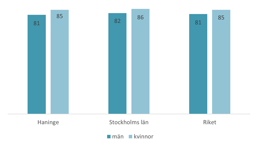 Medellivslängden i Haninge är 85 år för kvinnor och 81 för män. Det är något lägre än för Stockholms län, men på samma nivå som riket (hela landet).