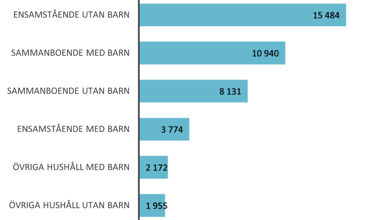 Drygt en tredjedel av alla hushåll består av en enda person. Den näst vanligaste hushållstypen är sammanboende med barn, vilket utgör drygt en fjärdedel av kommunens hushåll. Ungefär var femte hushåll är sammanboende utan barn och var tionde ensamstående med barn.