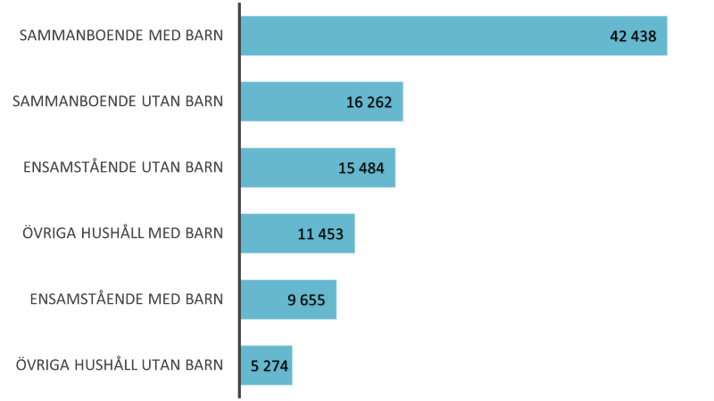 Flest personer, 42 procent, bor i hushållstypen sammanboende med barn. I hushåll, sammanboende utan barn, bor 16 procent av invånarna. Tio procent av invånarna bor i hushåll, ensamstående med barn, och 15 procent bor i hushåll, ensamstående utan barn. Övriga hushåll kan exempelvis vara flergenerationsboende eller kollektiv.