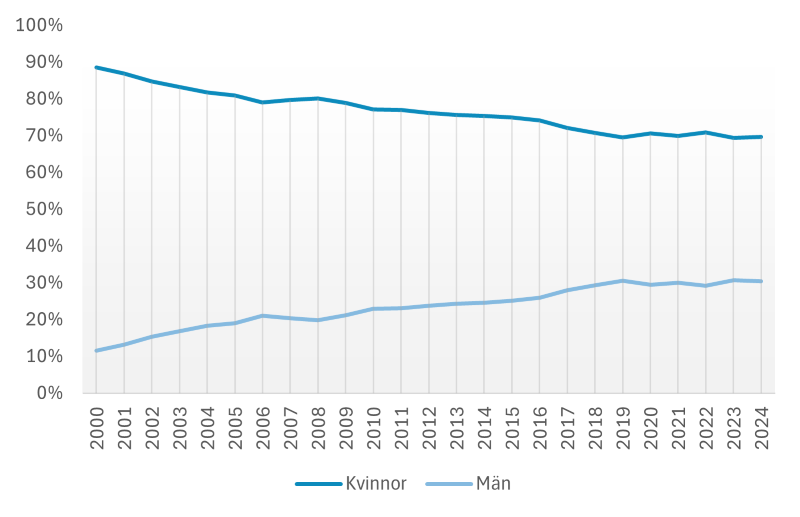 Andel utbetalade nettodagar med föräldrapenning, fördelat på kön 2000–2024