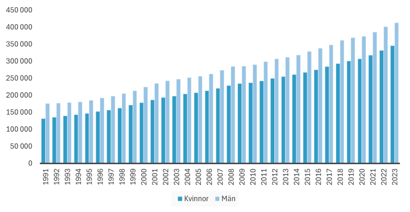 Kvinnors och mäns medianinkomst 1991–2023