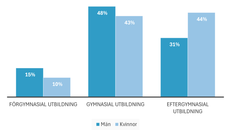 Det är en större andel kvinnor som har eftergymnasial utbildning än män. Bland män är det en större andel som har gymnasial utbildning som högsta nivå.