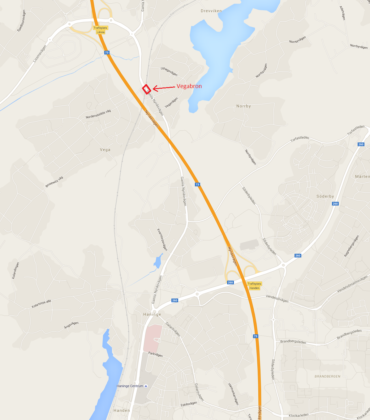Från 24 juni till och med 19 augusti stängs vägbron över tågspåret på Gamla Nynäsvägen (vid Vega, strax intill Nordenskiölds väg) av i båda riktningarna för både biltrafik och fotgängare. Alternativa vägar kommer att skyltas upp.