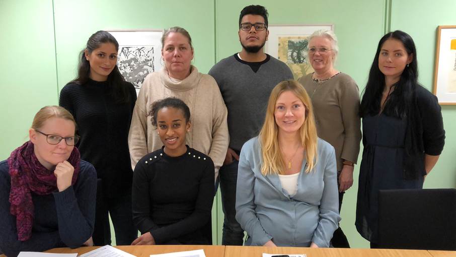 På bilden ser vi student Sinit Tesfaslassie med sin handledare Susanne Loy, student Adessa Basmaci med sin handledare Lina Karlsson Heimerlöv, student Amardev Budakoti med sin handledare Hanna Örthagen samt förvaltningens VFU-samordnare Birgitta Nordström och hennes kollega Karoline Karlsson.