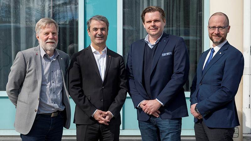 Från vänster till höger på bilden: Göran Svensson (S), ordförande i näringslivs- och arbetsmarknadsnämnden, Ibrahim Baylan (S), näringsminister, Tobias Hammarberg (L), vice ordförande i kommunstyrelsen tillika ordförande i förskole- och grundskolenämnden, och Magnus Gyllestad, kommundirektör.