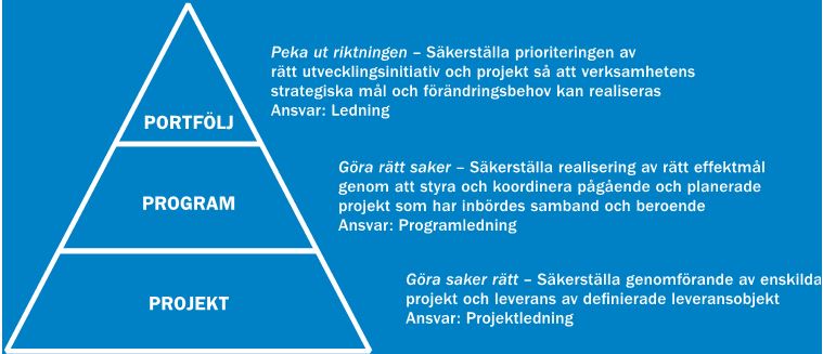 Portföljstyrningsmodellen bygger på tre nivåer – portfölj, program och projekt. I en portfölj ingår program med samma inriktning. I ett program samlas sedan de projekt som rör programområdet.