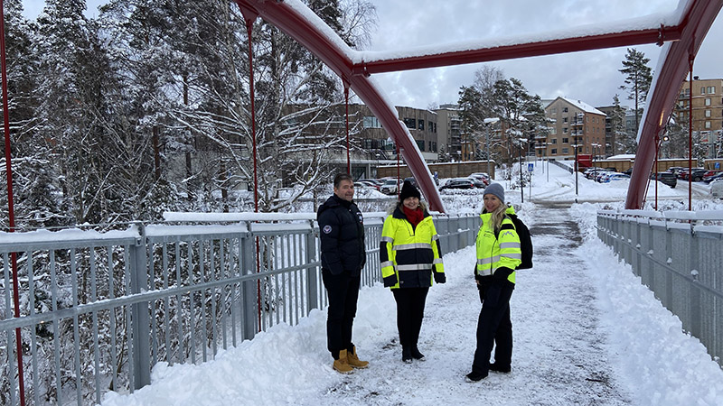 Göran Buss, park och teknik, Helene Hill, stadsbyggnadsdirektör och Jessica Öhr Hellman, enhetschef projekt genomförande vid den nyöppnade Bodekullsbron som leder till RudanFoto: Haninge kommun