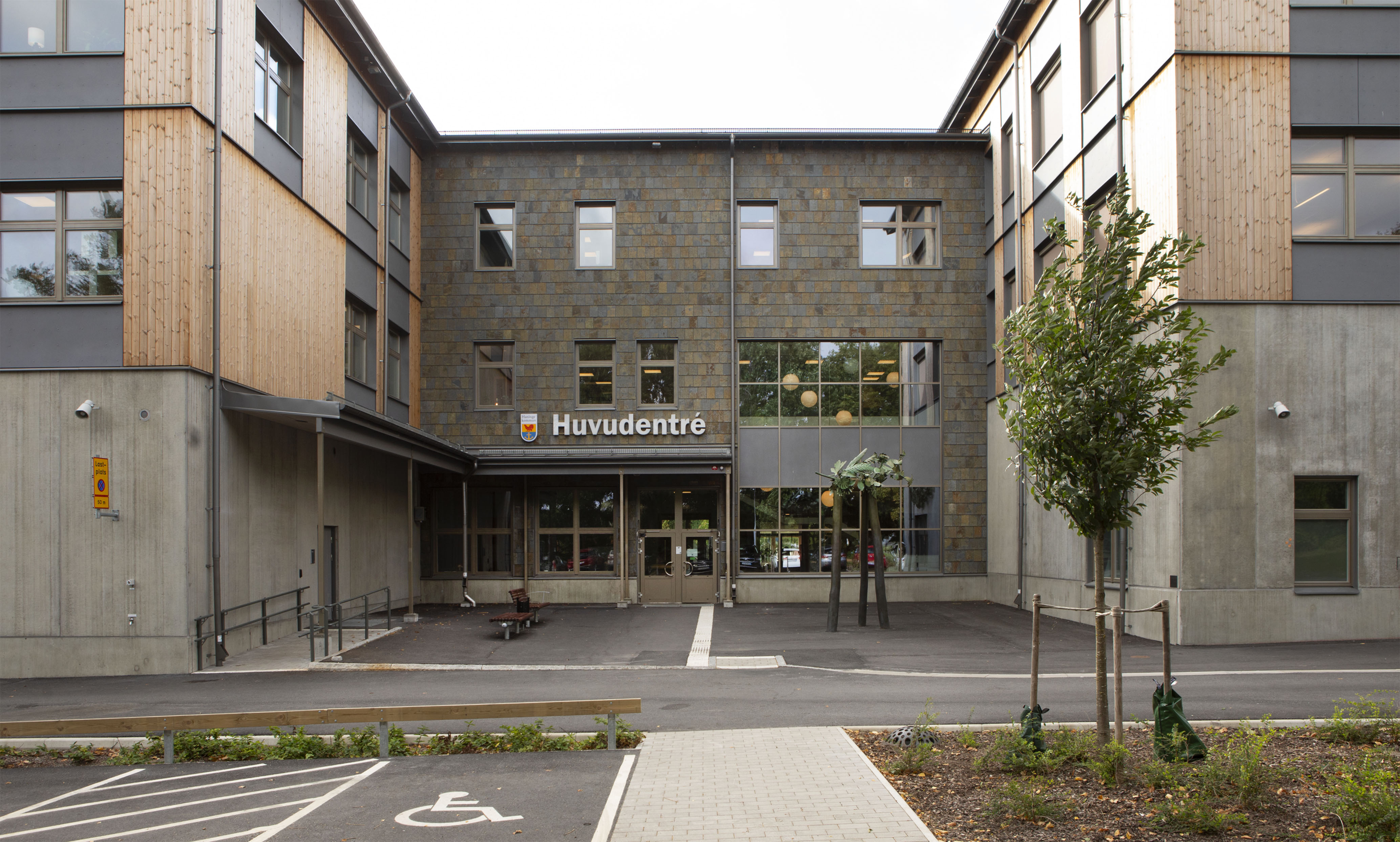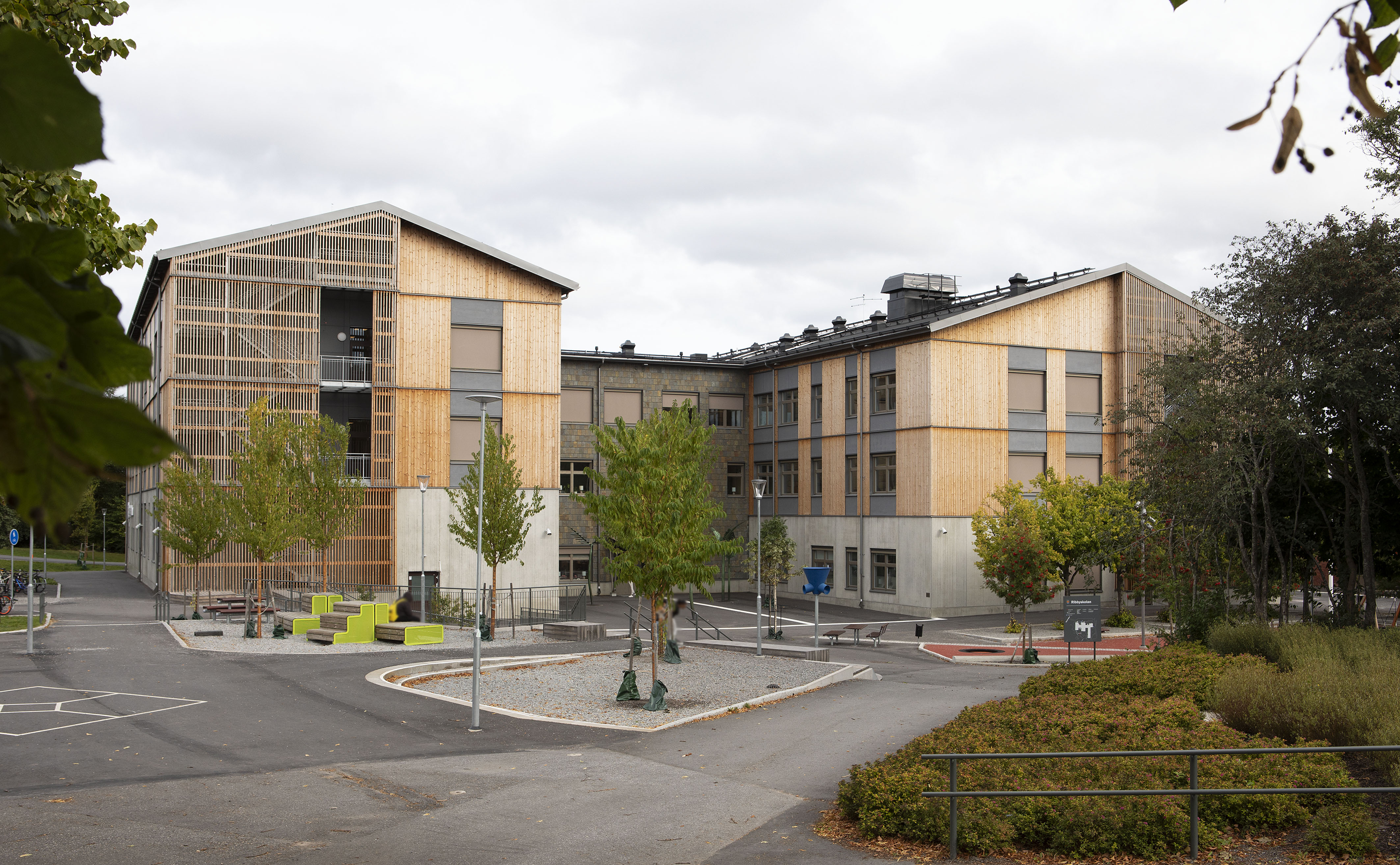 MAX arkitekter har med bravur tagit sig an uppgiften. Genom att bryta upp byggnaden i mindre volymer, blir det en tydlig koppling till omgivande bebyggelse men även en naturlig uppdelning av skolans olika funktioner. Den centrala huskroppen får då funktionen som skolan hjärta, där de olika delarna binds samman genom trapphus och entréer.