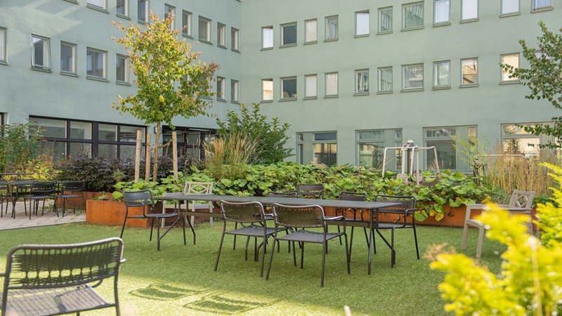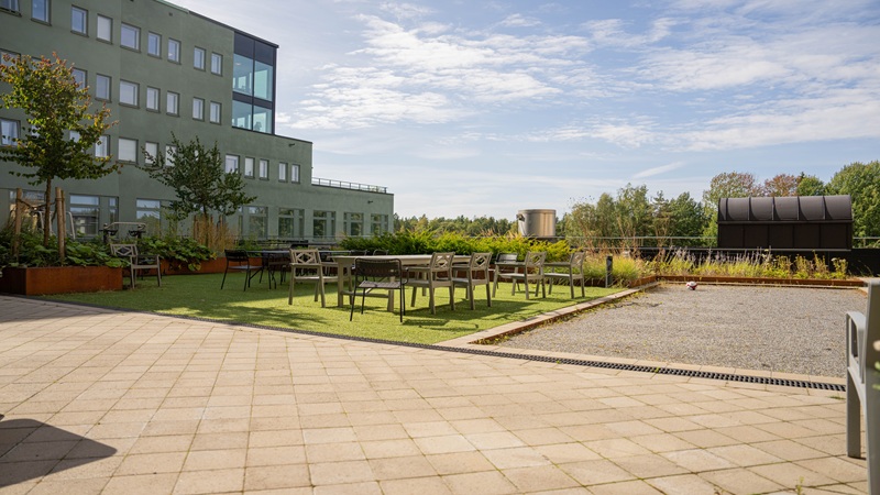 Upptäck Terrassens takterrass – en lugn oas med fantastisk utsikt över naturen, perfekt för både avkoppling och aktivitet.