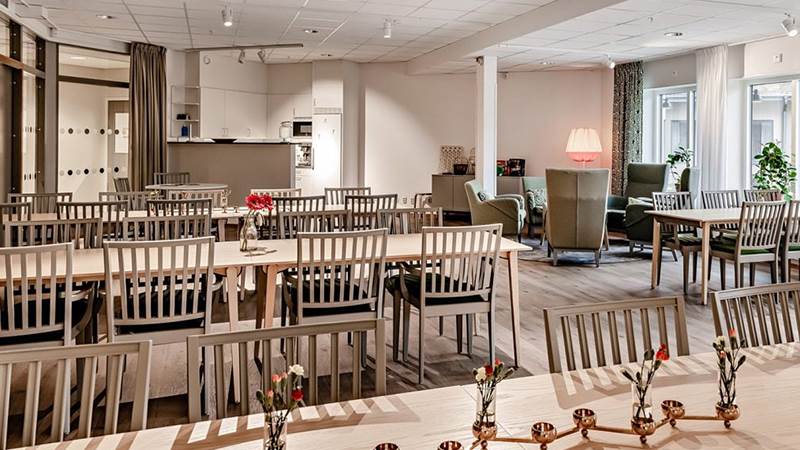 Vid helger och högtider dukar vi extra fint och erbjuder en trerätters meny med ett glas vin eller öl. Kaffe och frukt finns när du vill ha. Maten tillreds på avdelningarna och vi bakar ofta.