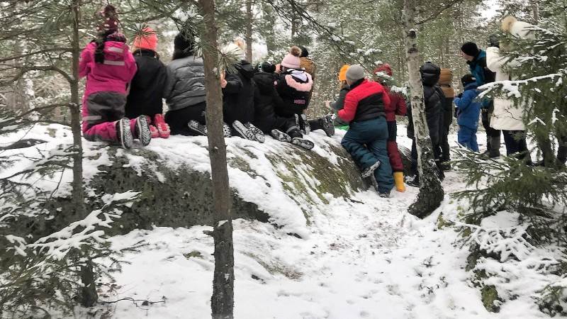 Klassen har förarbetat ämnet vinterekologi i skolan och får hos oss uppleva praktiskt och genom lek hur naturen anpassar sig till vintern.