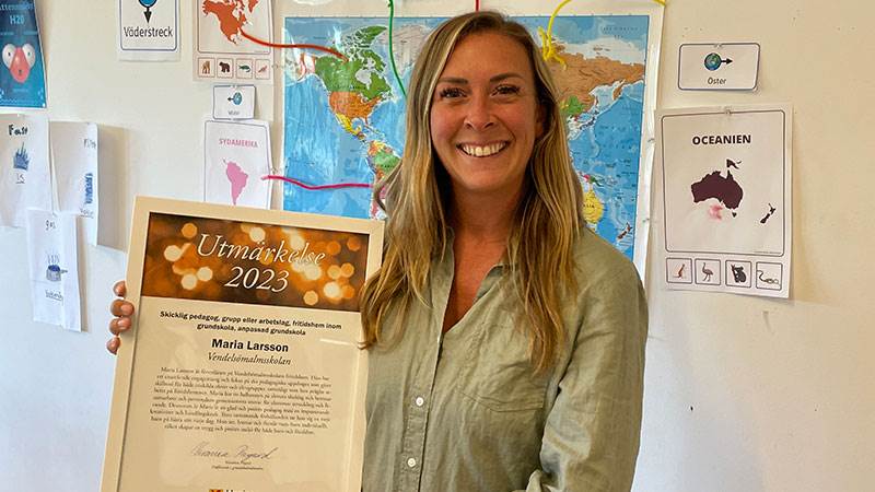Motivering: Maria Larsson är förstelärare på Vendelsömalmsskolans fritidshem. Hon har ett enastående engagemang och fokus på det pedagogiska uppdraget som gjort skillnad för både enskilda elever och elevgrupper, samtidigt som hon präglat arbetet på fritidshemmet. Maria har en helhetssyn på elevens skoldag och betonar samarbete och personalens gemensamma ansvar för elevernas utveckling och lärande. Dessutom är Maria är en glad och positiv pedagog med en imponerande kreativitet och handlingskraft. Trots utmanande förhållanden tar hon sig an varje barn på bästa sätt varje dag. Hon ser, lyssnar och förstår varje barn individuellt, vilket skapar en trygg och positiv miljö för både barn och föräldrar.