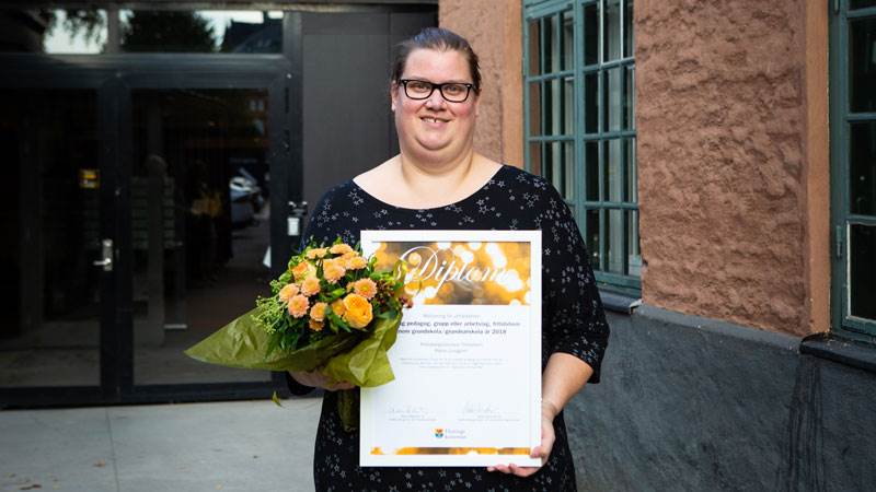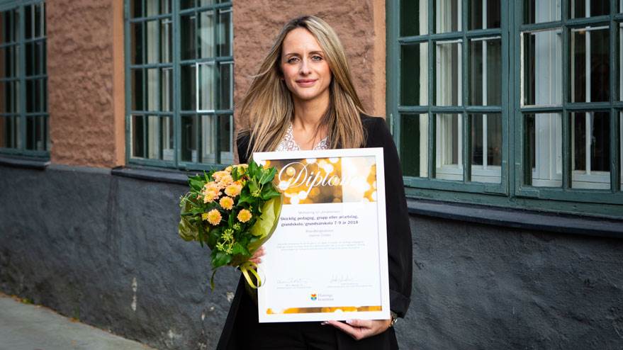 Maria får utmärkelsen för att hon är en suverän pedagog som strävar efter att utvecklas och lära mer. Hon ser varje barn och är en trygg klippa som bidrar till en professionell och välplanerad verksamhet.