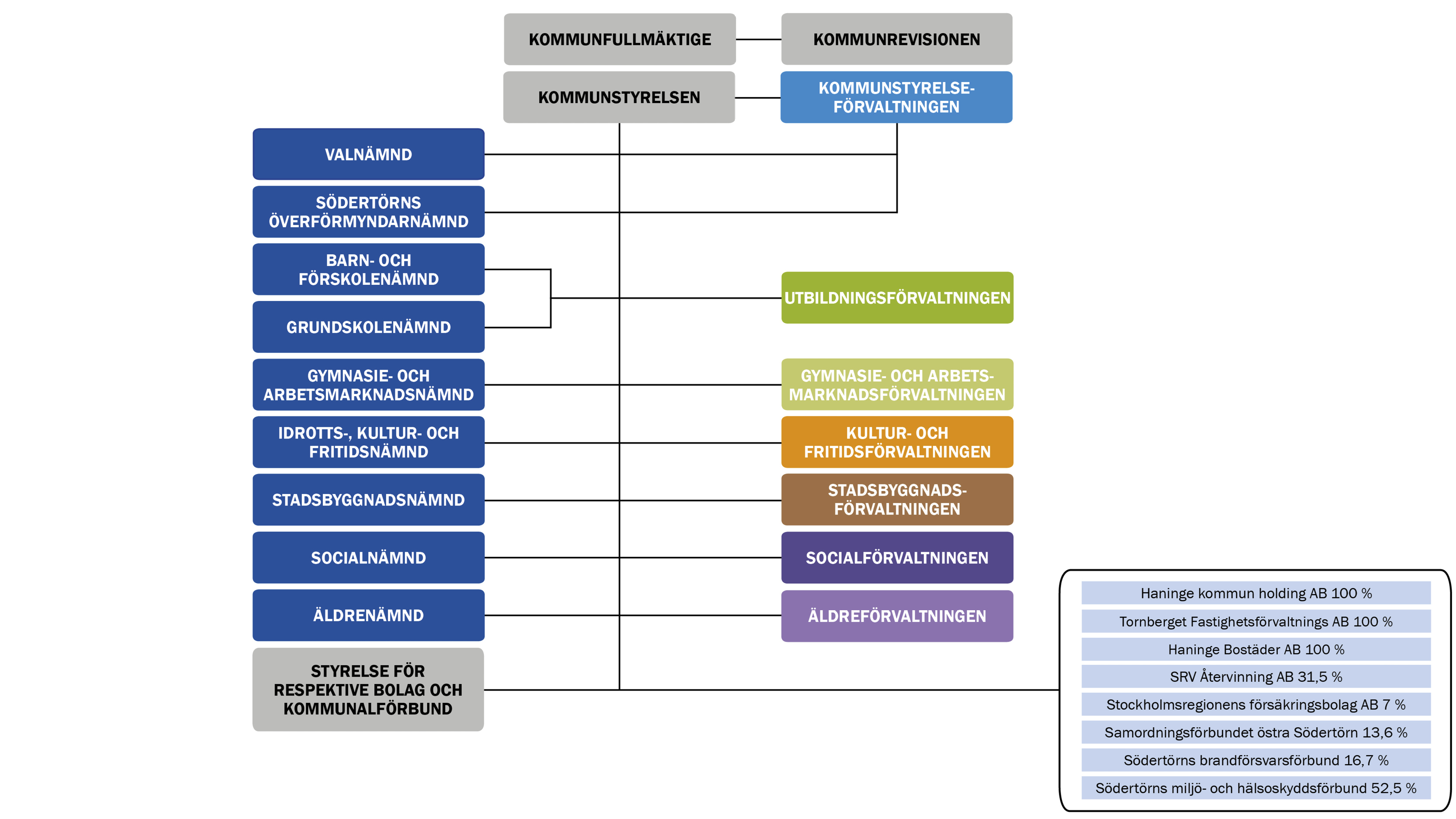 Kuntaa johtavat poliittisten puolueiden edustajat, jotka valitaan joka neljäs vuosi pidettävissä kunnallisvaaleissa. Toiminnasta päätetään kunnanvaltuustossa, kunnanhallituksessa ja lautakunnissa, jotka ovat vastuussa kunnan eri toiminnoista. Jokaisella lautakunnalla on hallinto, jonka virkamiehillä on tehtävänä toteuttaa lautakuntien tekemät päätökset.