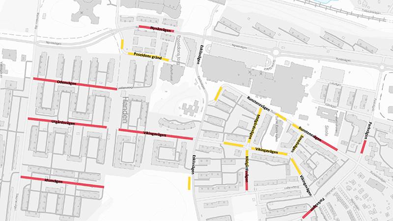 Määräykset koskevat seuraavia katuja: Runstensvägen, Vikingavägen, Parkvägen, Smedvägen, Midgårdsvägen, Nynäsvägen, Poseidons gränd, Utgårdsvägen, Odenvägen, Idunvägen sekä Eskilsparkenin pysäköintialuetta Handenin keskustassa.