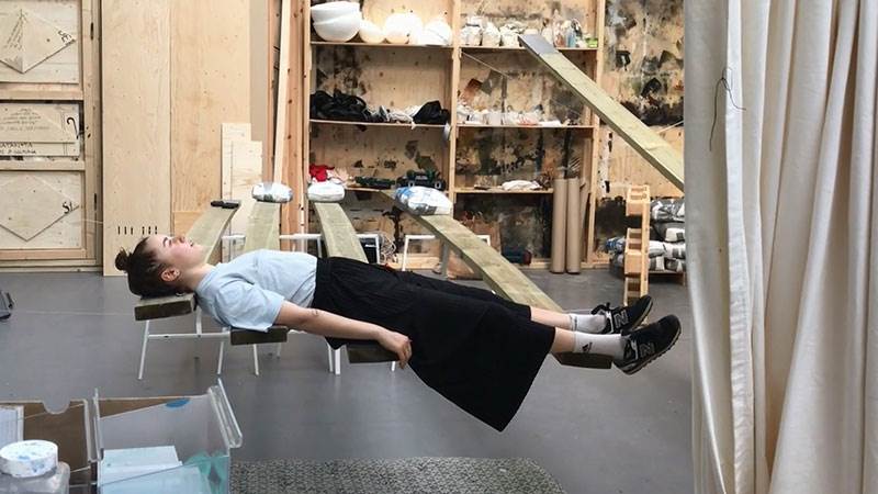 I det nya verket Fält experimenterar den nyutexaminerade konstnären Adèle Essle Zeiss med hur kroppen kan balansera i horisontellt läge. Hon undersöker om det skulle kunna vara möjligt att vänja kroppen vid andra sätt att fördela vikten än vi gör när vi håller oss upprätta.