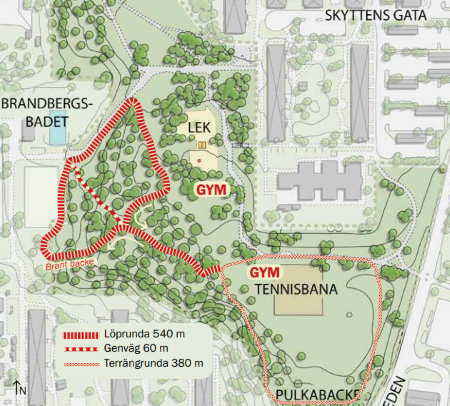 - Hela rundan startar och slutar nära tennisbanan och är 540 meter. En del är brant – perfekt för benträning i backe eller backintervaller.