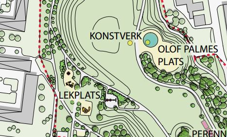 Nu vet vi vad ni Haningebor önskar med parken, och planen är klar. Vi har vänt och vridit på alla fina förslag och tittat på vad som är möjligt utifrån projektets ekonomi och parkens förutsättningar. Vi kommer fokusera på tre platser: lekplatsen, platsen vid Eskilsvägen samt amfiteatern och dammen.